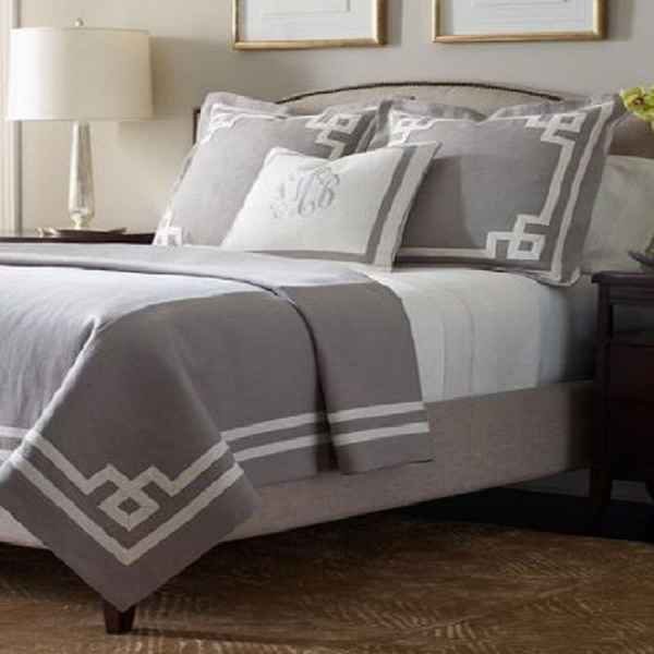 Duvet Cover or Coverlet in (U) Slubby Linen with Contrast Fretwork at Flange for duvet and contrast fretwork on top of bed for coverlet.