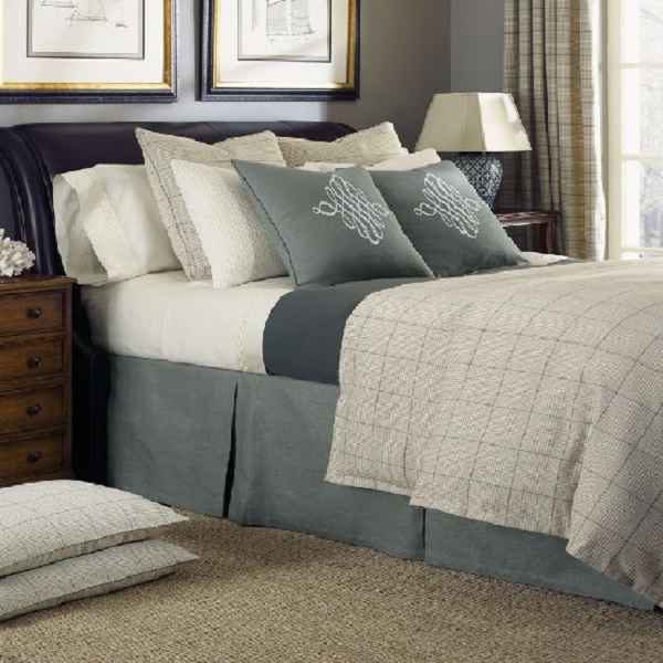 Bedskirt in Jefferson Flint Tailored with standard 15″ drop on three bands with pins to attach to box springs