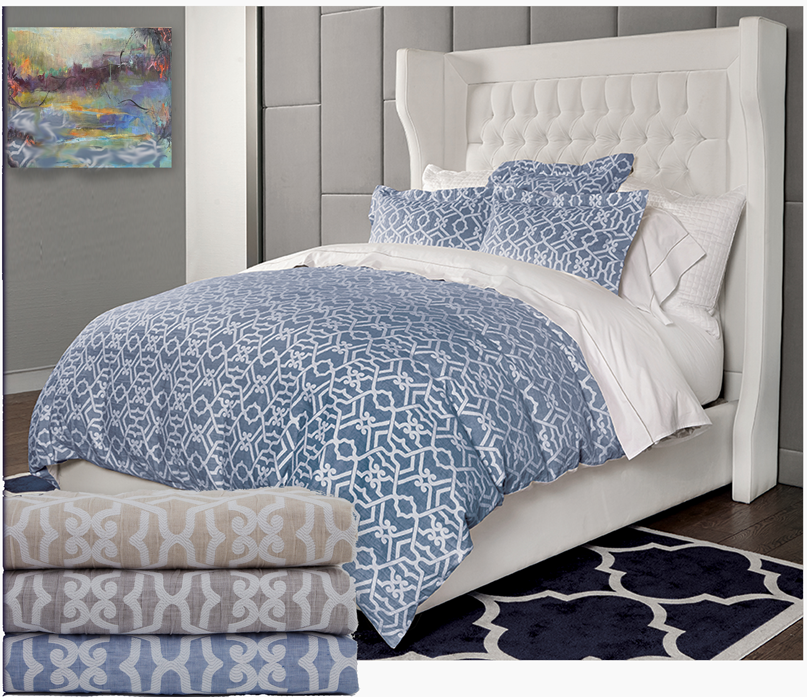 The Taylor Duvet Cover is a luxurious and stylish bedding set featuring a blend of textures and fabrics. Made from Linen and Cotton Jacquard, providing a textured, elegant, and breathable surface. The reverse side of the duvet cover is a solid white percale sheeting, which is smooth, crisp, and cool to the touch—great for comfort against the skin.