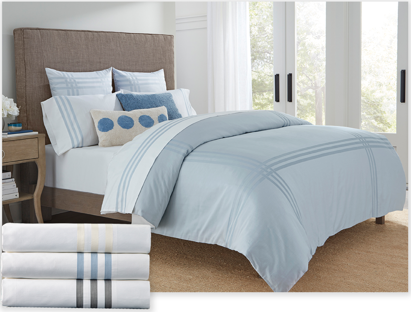 Sheet sets, duvet cover & shams, beautifully decorated in a triple woven stripe pattern for a seamless design.