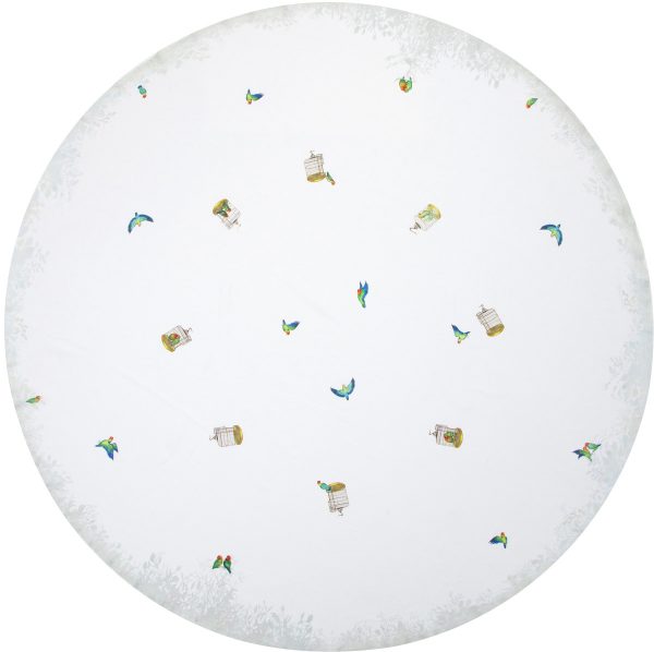 – White round linen tablecloth with lovebirds and leafy border