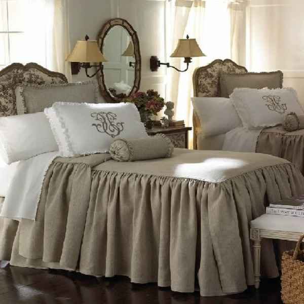 Bedskirt:  Essex Flax Ruffled with standard 15″ drop on 3 bands with pins to attach to box springs.