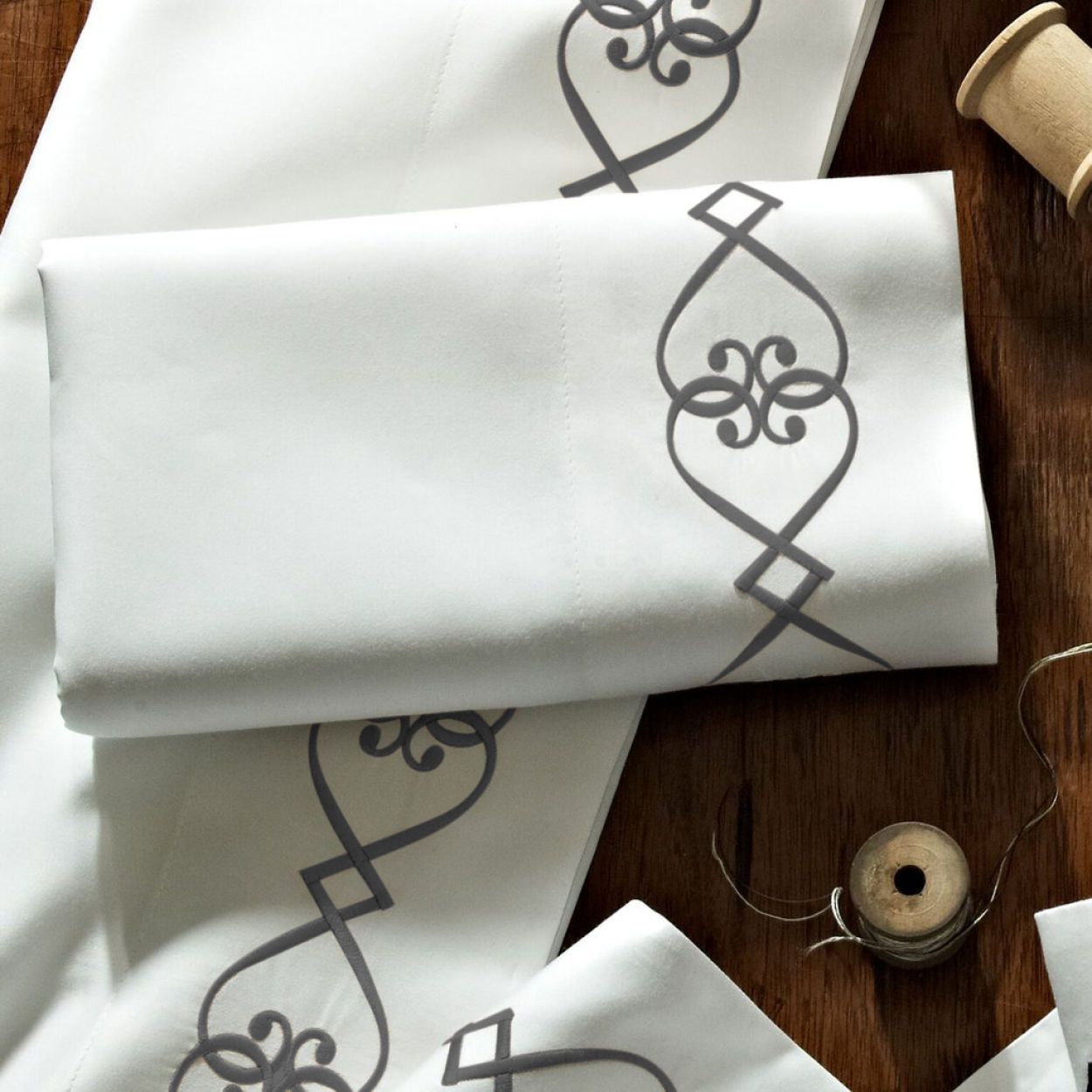Embroidered in our Dallas workroom, the threads of the Concerto design weave in a continuous heart pattern. Embroidery is sewn onto our best-selling Soprano sheet. Select a Soprano Fitted Sheet and a pair of Concerto Embroidered Sateen Pillow Cases for a complete set. 100% long-staple cotton, 420 thread count sateen. Made in the USA from Portuguese fabric.