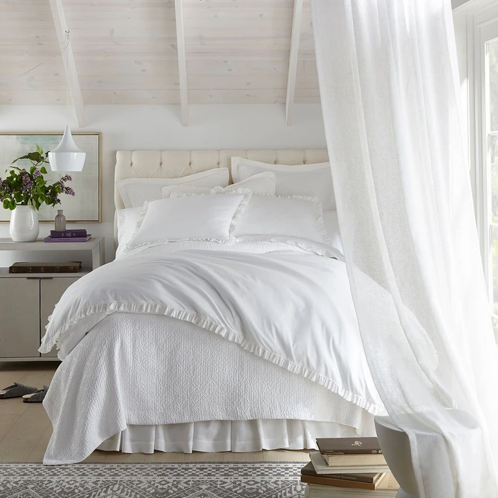 For those who love the classic all white bed but are looking for a more casual style, this washed white percale offers an effortless look. Ellie’s delicate raw pleated trim defines the edges of the duvet cover and pillow shams.
