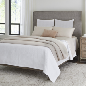 How do you make your best-selling product even better? Add a trim! With a classic design that is alluring and appealing, Soprano Trim utilizes our fan favorite Soprano sheeting as an applique that is made by hand in our Dallas workroom. The collection combines our white Soprano sheeting with a 2″ trim in a contrasting Soprano fabric. The applique is sewn flat with mitered corners that creates handsome and luxurious design.