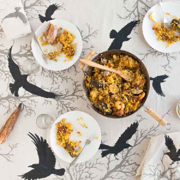 - – Stunning modern linen tablecloth with crows circling against silhouetted branches